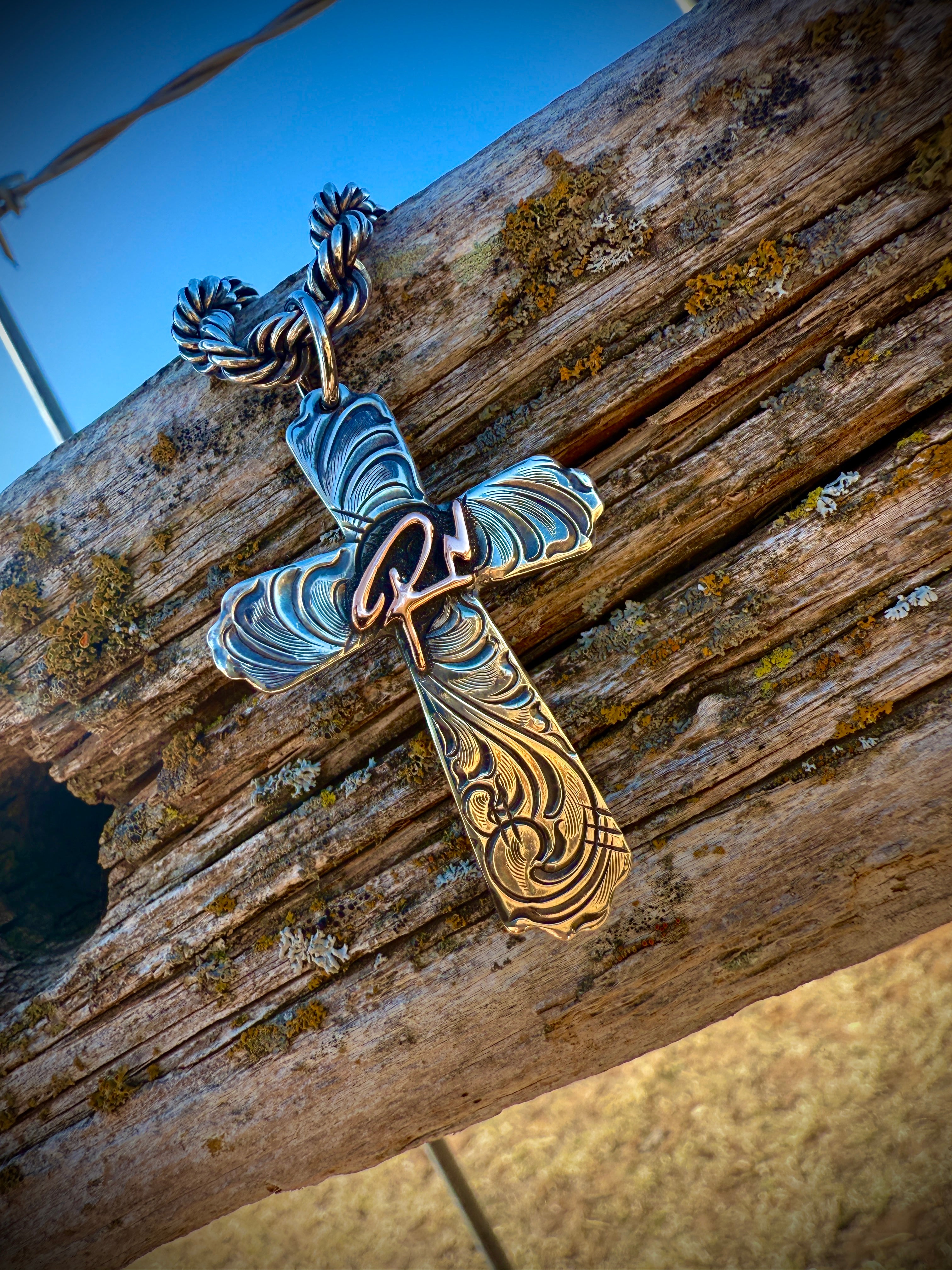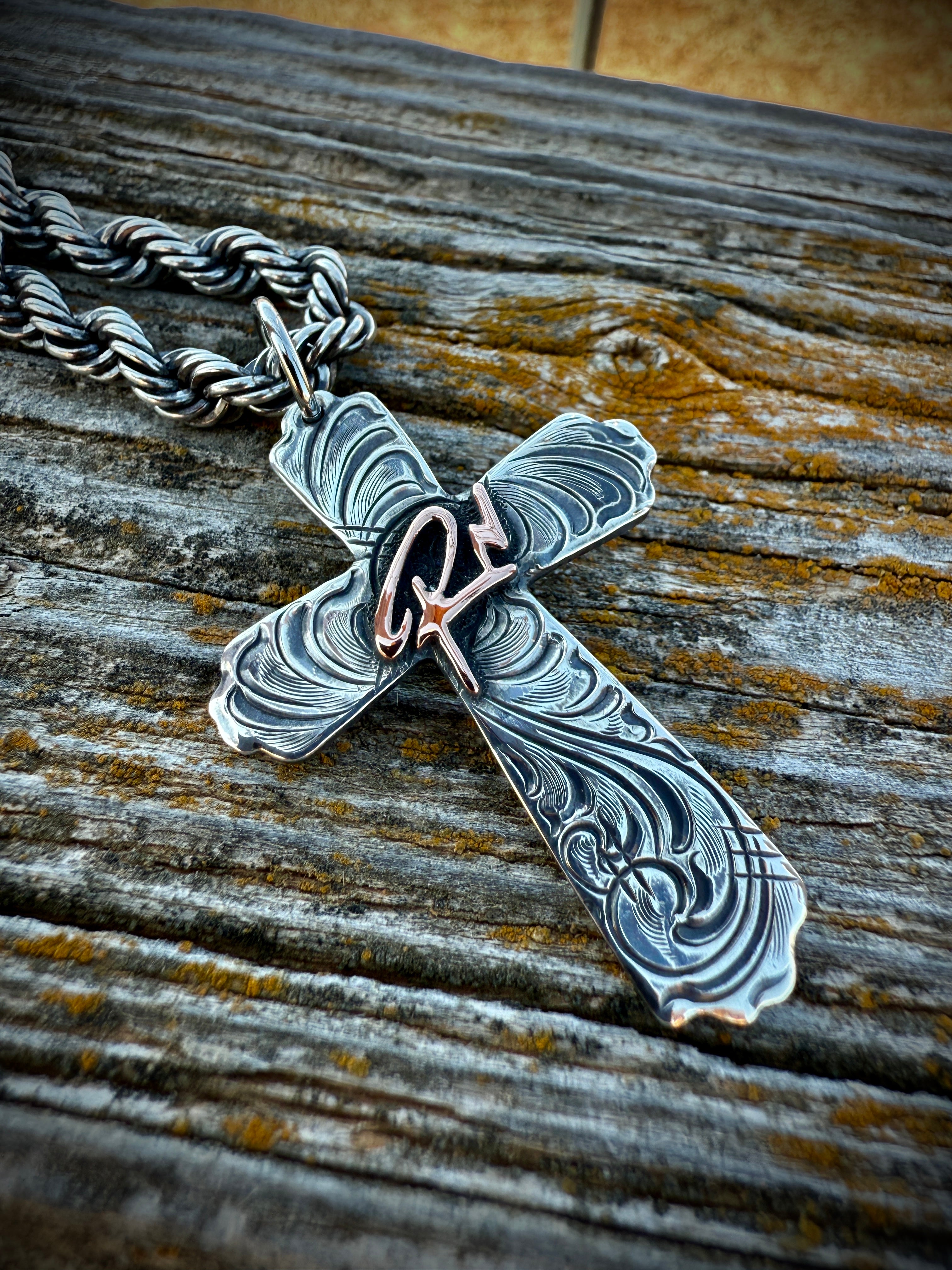 The Blue Collar Cross!!! New for 2026 handmade solid sterling silver cross pendant with an option for personalization. We can do Brands, Initials, Silhouettes or Logos. Shown here with our 5mm Weathered Sterling Silver Rope Chain. This one works well with any of our chains up to 7mm.