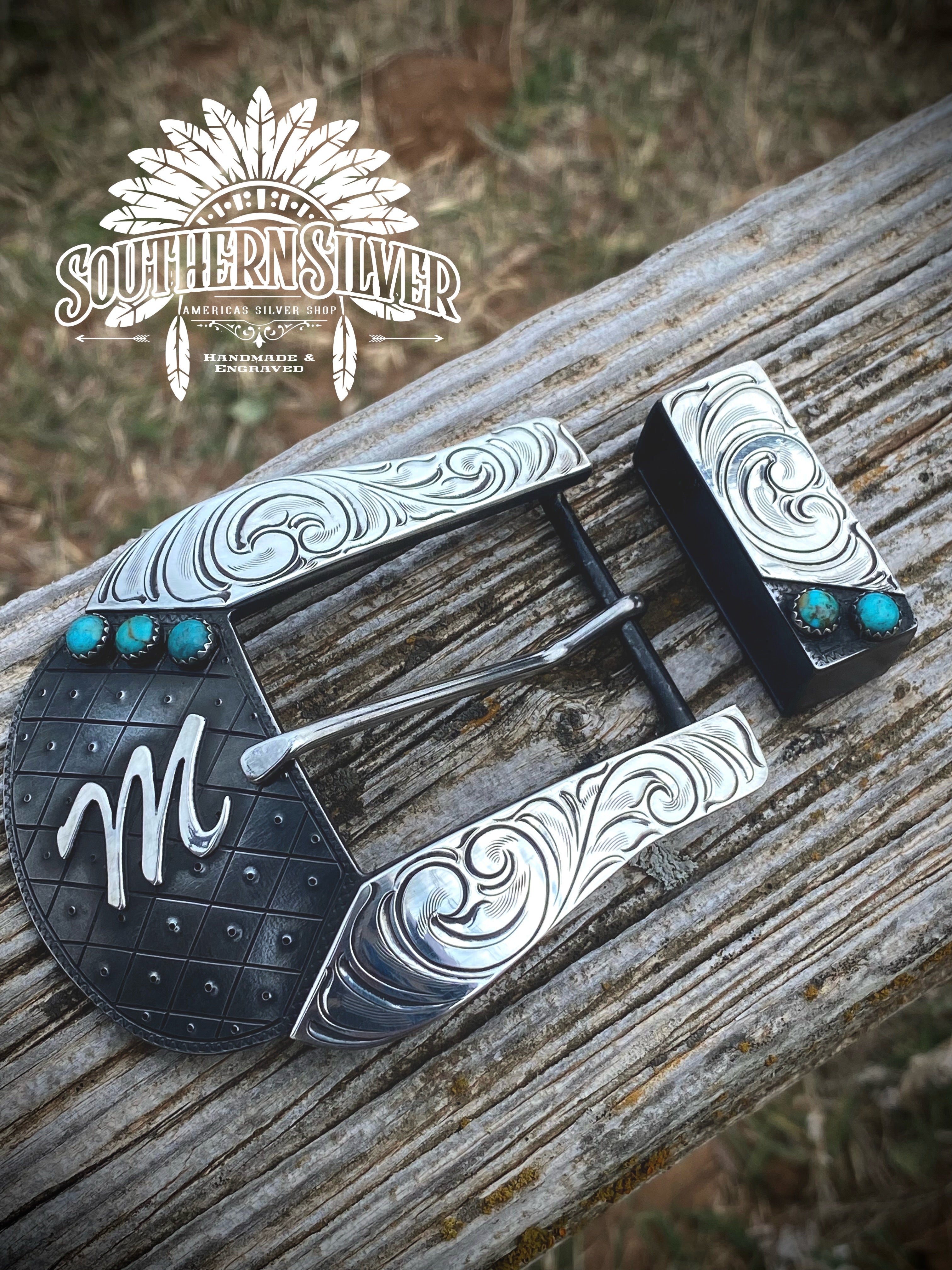 Our Rio custom belt buckle will work with any standard sized belt. 1.5" You can personalize this one with Brands, Initials, Silhouettes, or Logos. We set this one up with 6 pieces of natural turquoise and each one will be unique.
