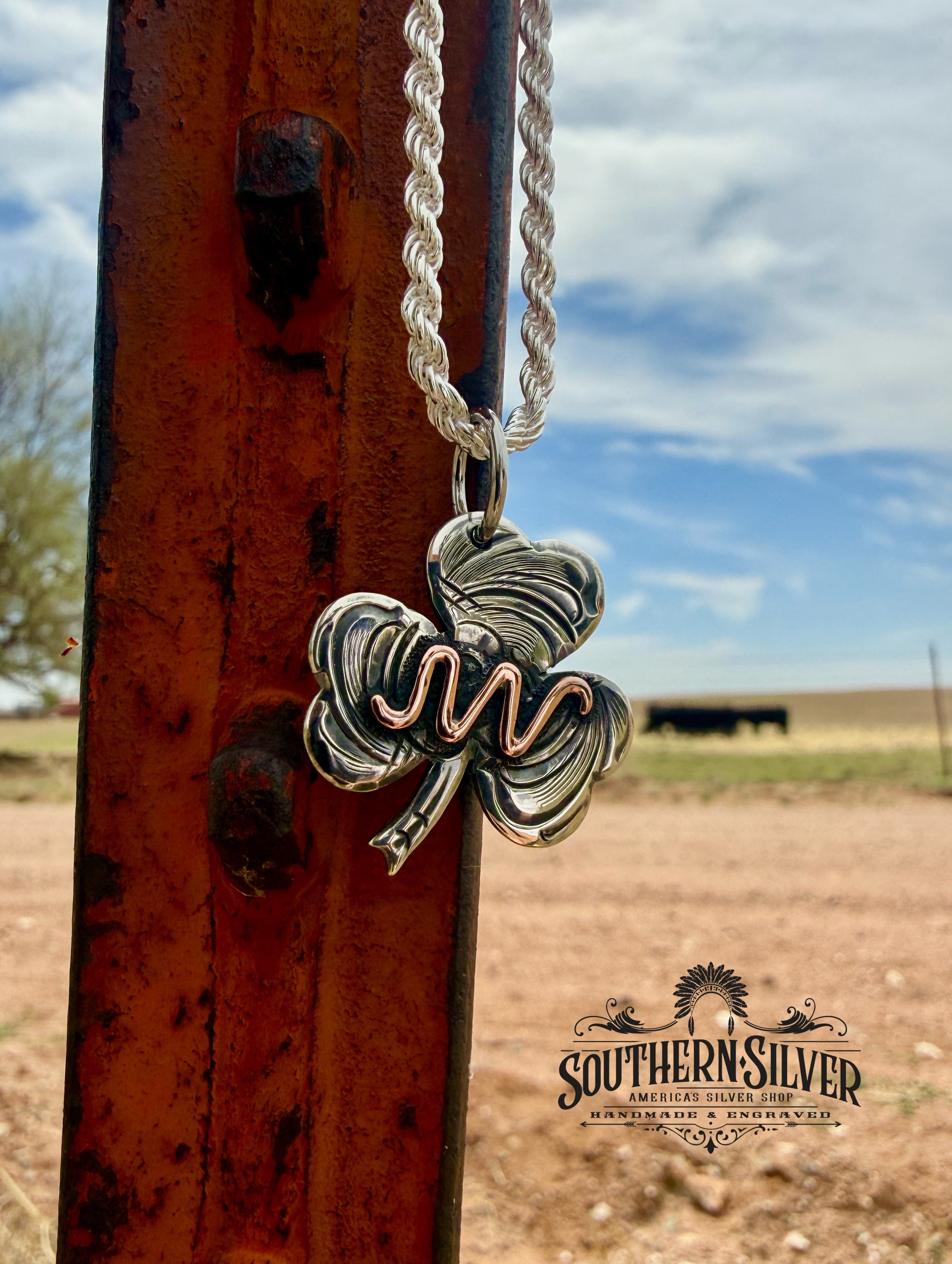 The Shamrock is made with solid sterling silver and fully engraved. You can personalize this one with Brands, Logos, Silhouettes or Initials. You also have the option of Copper, Silver or Brass for your personalization. Size on this one is 1.25".